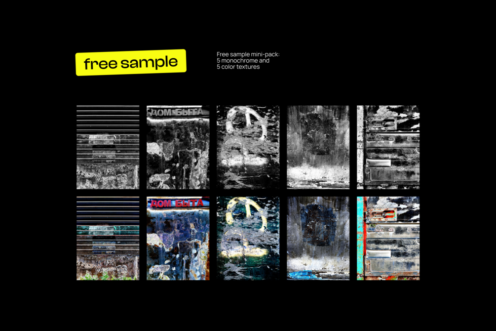 - free sample pack → 10 high resolution textures from full pack: 5 monochrome and 5 full color.